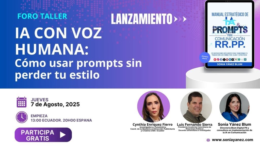 Hola, soy Sonia Yánez Blum y quiero invitarte al Foro Taller IA con Voz Humana, un evento en vivo donde presento el Manual Estratégico de IA y Prompts para Comunicación. Mucho más que un PDF: un sistema vivo con herramientas para transformar tu trabajo profesional.